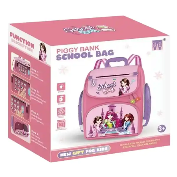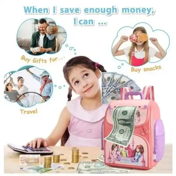 قلک موزیکال کودک طرح کوله‌پشتی پرنسسی با سنسور اثر انگشت | گاوصندوق اسباب‌بازی ATM