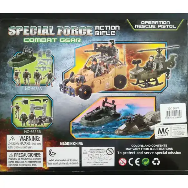 اسباب بازی جنگی مدل نیروهای مخصوص دریابانی طرح قایق موتوری یک ست اکشن و نظامی برای کودکان بالای ۳ سال است که شامل فیگورهای سرباز، قایق موتوری، سلاحها و تجهیزات نجات میباشد. طراحی واقعگرایانه و جزئیات دقیق آن، کودک را وارد دنیای تخیلی عملیاتهای دریایی و نجات میکند.